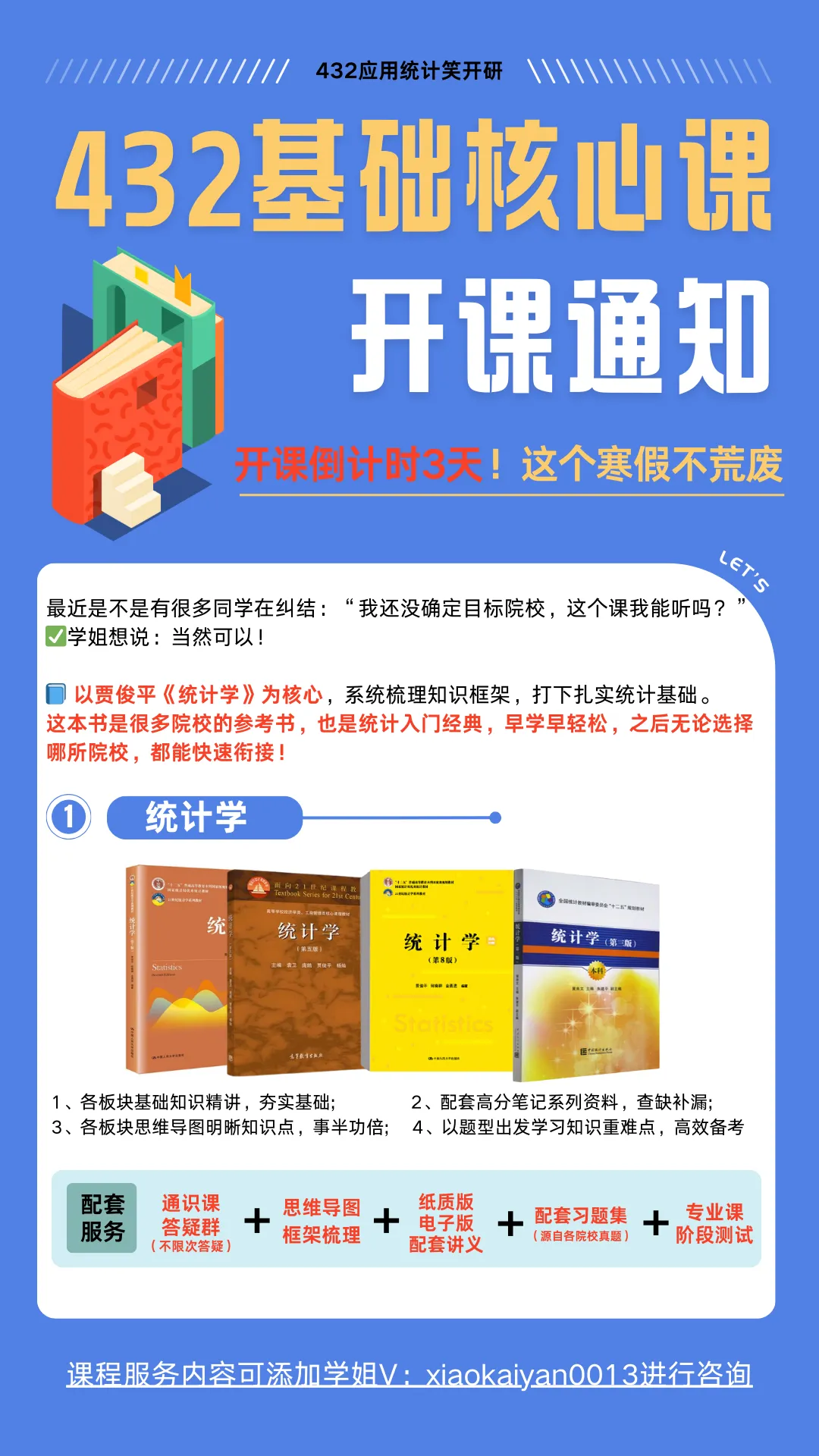 我们应用统计初试全程班将于1月11日晚20:00准时开课,帮你从寒假开始,系统打牢初试基础,稳步上岸!需要跟课学习的宝子+开研学姐xiaokaiyan0013咨询哦,入股不亏!