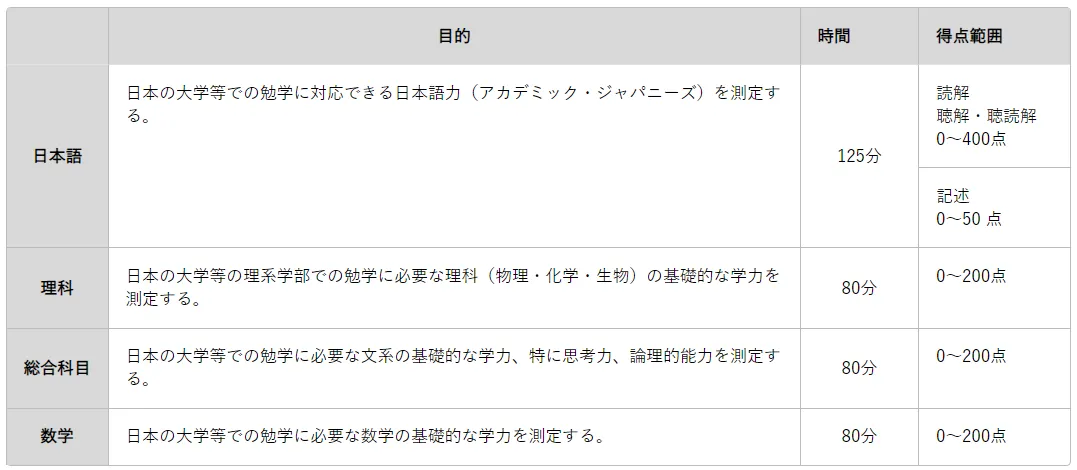 EJU共有四个科目的考核:日本语、理科、综合科目和数学。