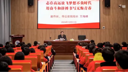 图2-3 抚州市副市长、市公安局局长万海峰为抚州信息工程学校师生讲授思政课