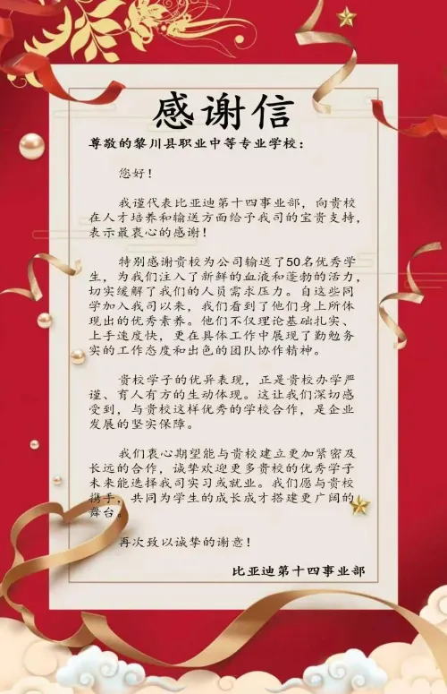 图6-1抚州比亚迪实业有限公司对我市中职学校的感谢信
