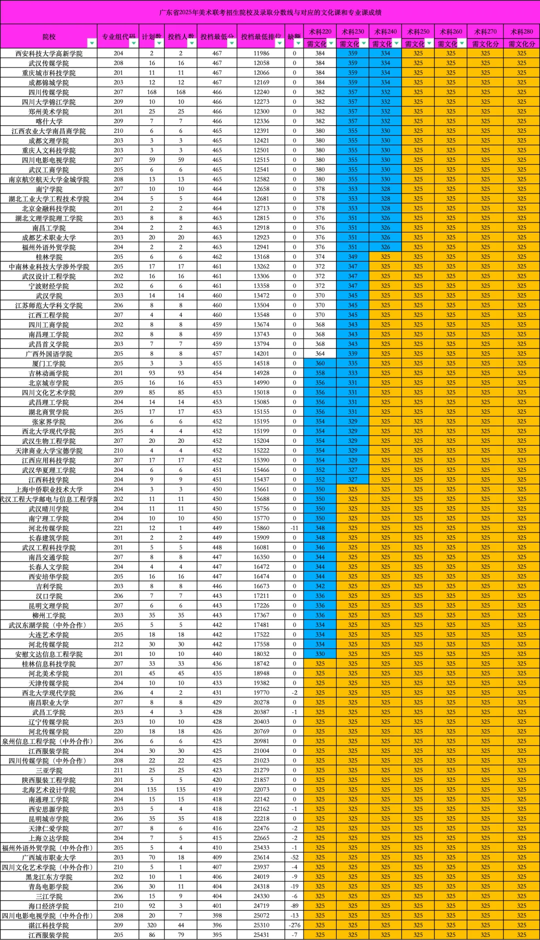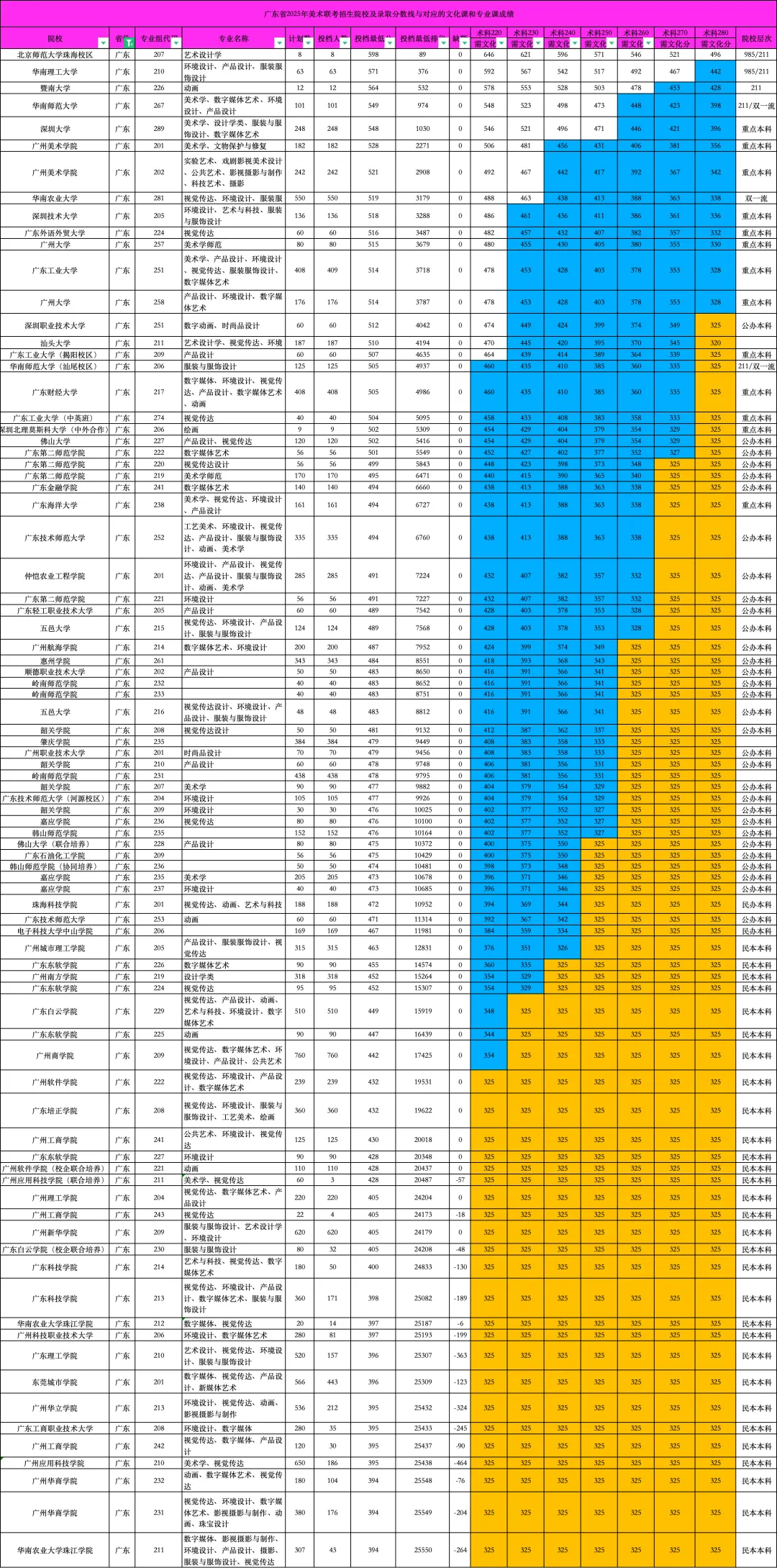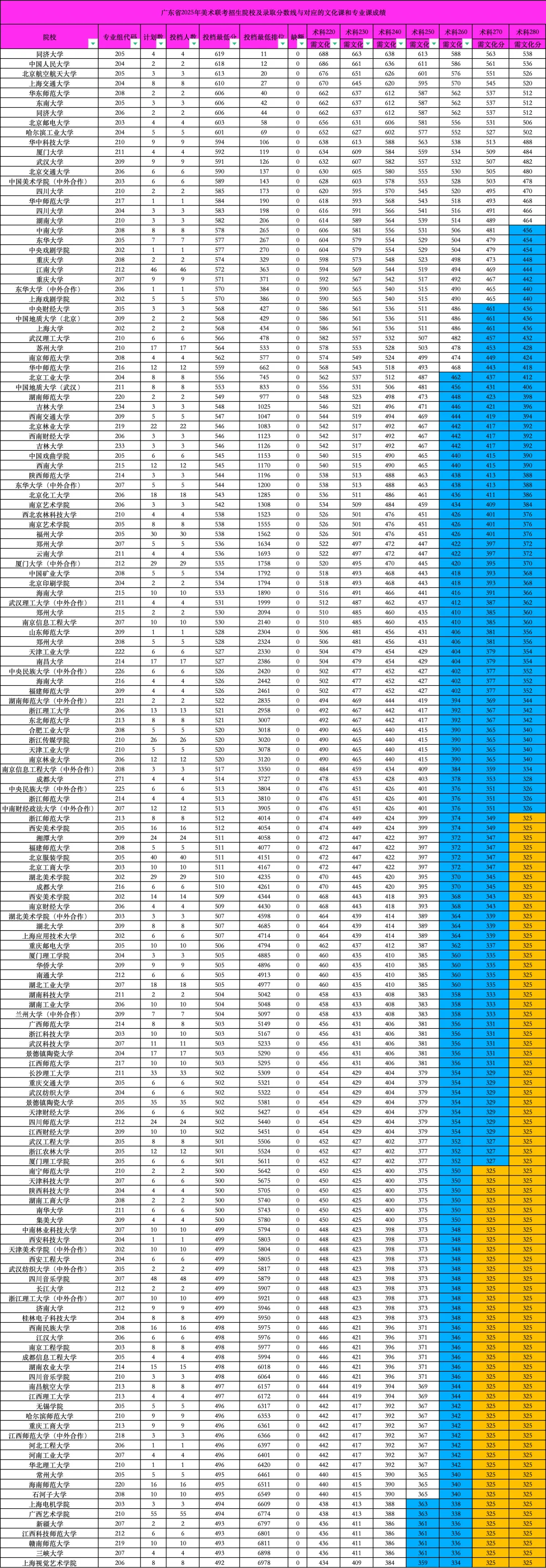 广东省2025年美术联考方向招生院校专业、计划及对应录取分数线、文化与联考成绩要求如下,如美术联考260分以上、文化本科线464分左右,联考方向可选众多985/211及双一流院校;文化过本科线可走校考。联考260分以上,即便文化未达本科线不能走校考,联考方向也有不少优质综合本科院校可选。