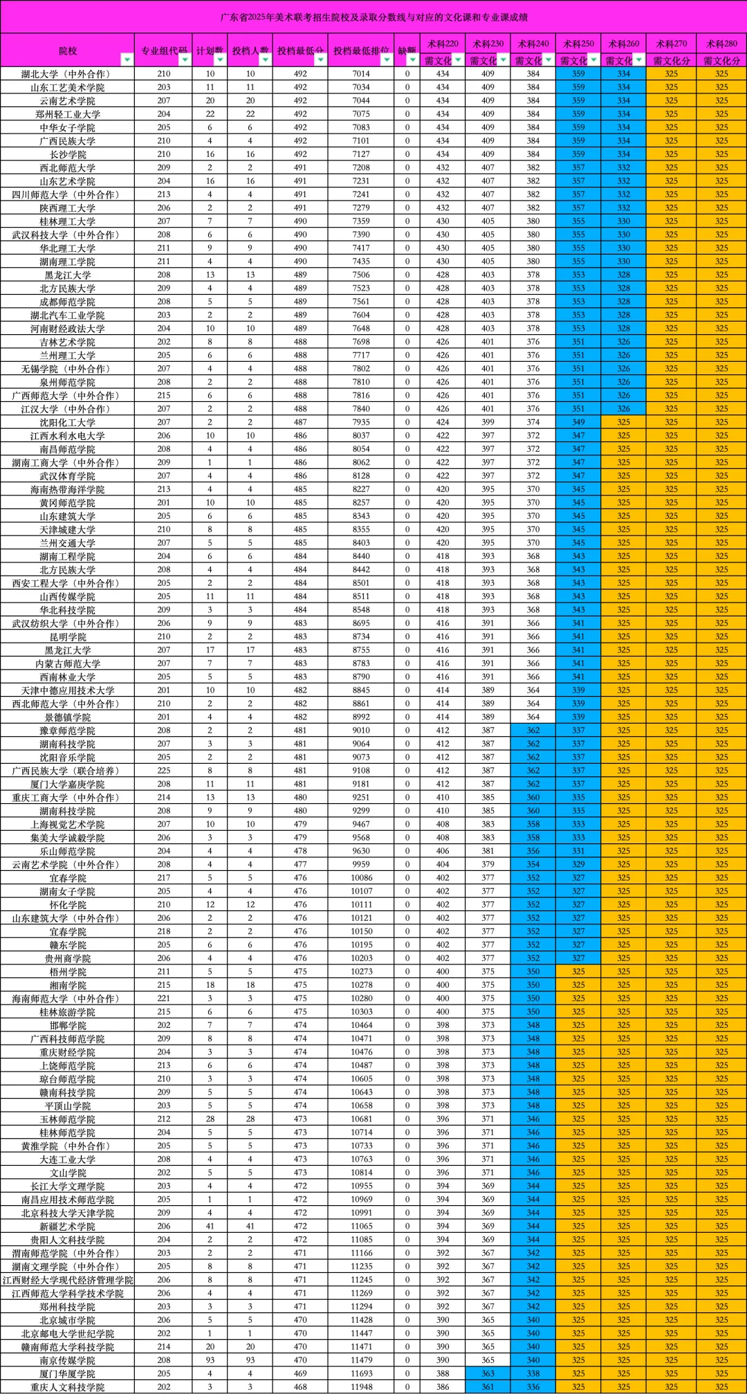 2025年美术类本科线:文化课总分325分 专业课总分185分,必须专业和文化双过线才能够填报美术类本科院校及专业