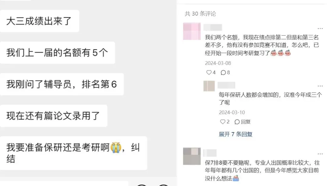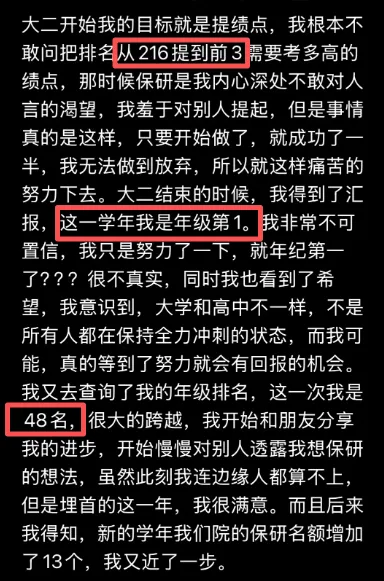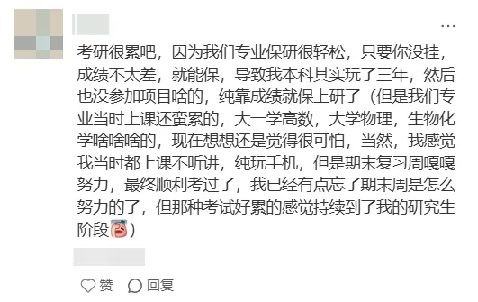 想要获得保研资格,必须从大一开始保持努力。课业成绩、科研项目、竞赛实践全都不能松懈。一旦稍有落后,便需投入更多精力追赶。这不仅考验个人的自律与内驱力,也意味着长期处于高压状态。