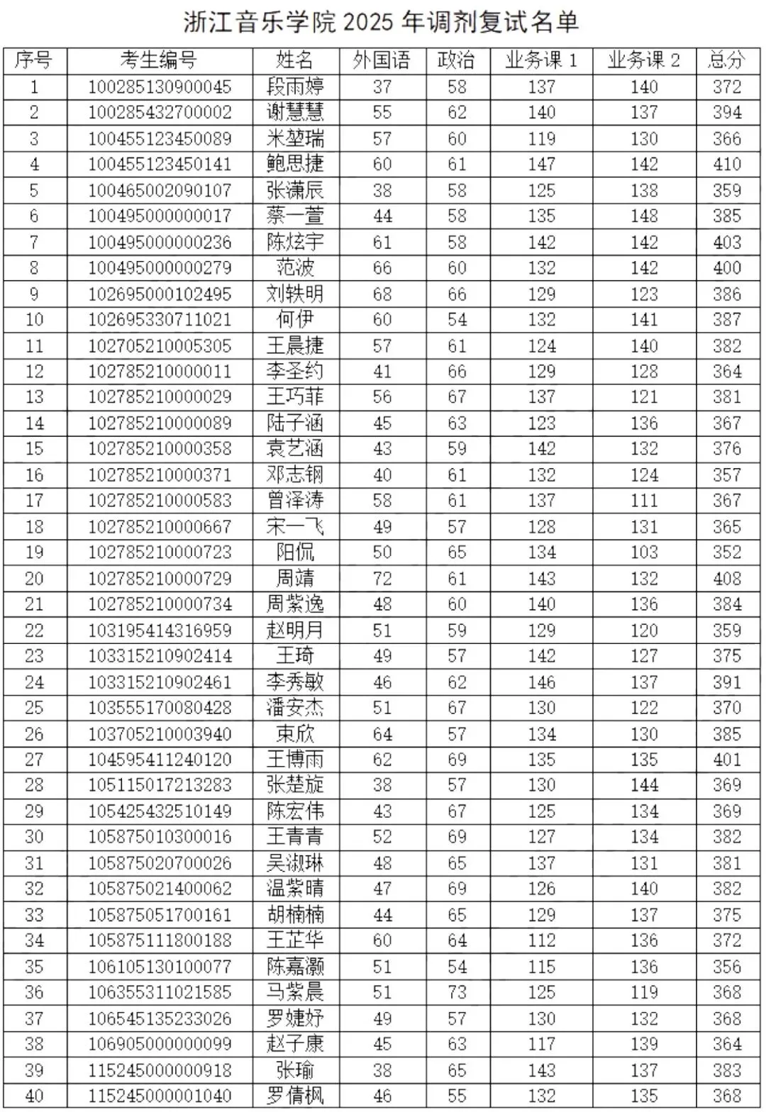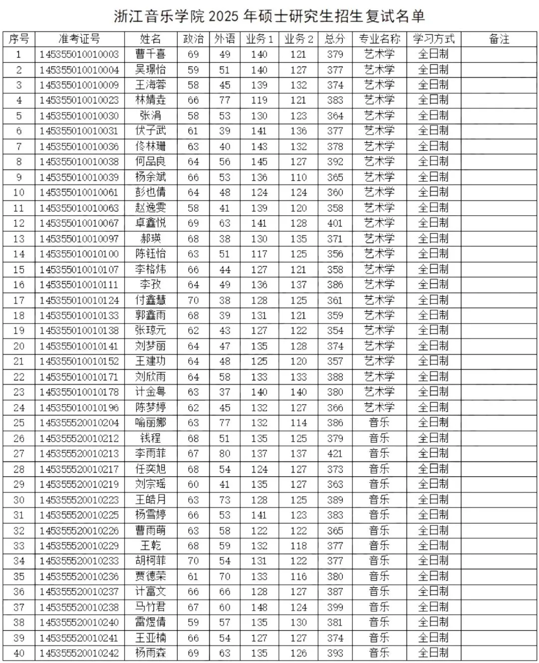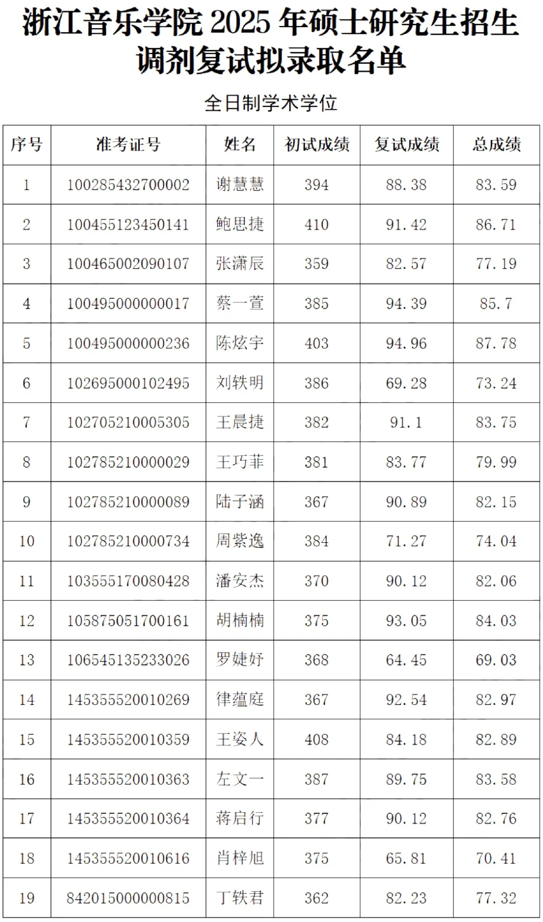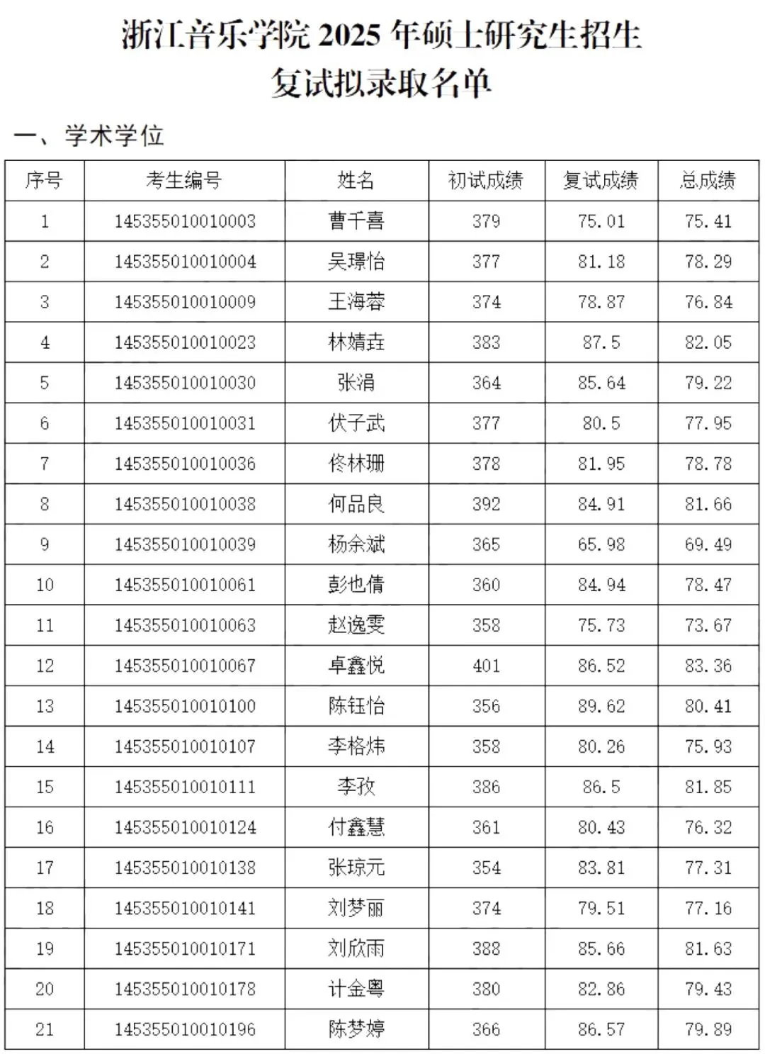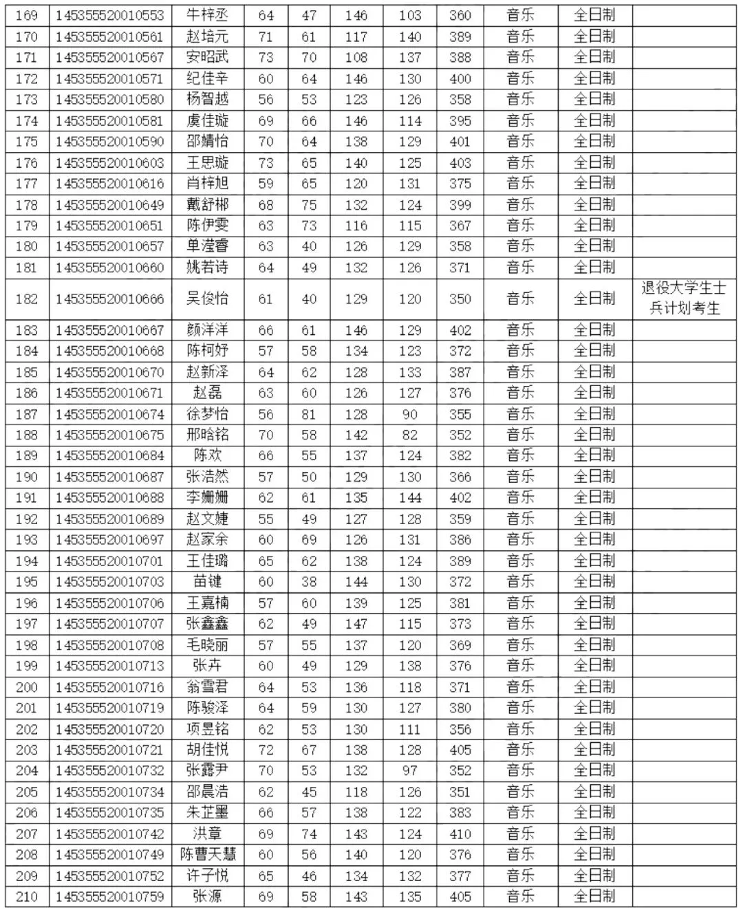 1.浙江音乐学院2025年考研各专业复试分数线均为国家线,即英语37、总分351(士兵计划分数线为30、323);总体差额比例不低于120%;2025年招生计划合计214人,最终拟录取合计214人,各专业均严格按照计划指标完成录取,具体分布为1301艺术学专业一志愿进复试24人录取21人、调剂进复试53人录取19人,1352音乐全日制一志愿进复试277人录取152人(含士兵计划2人),1352音乐非全一志愿进复试7人录取4人,1353舞蹈全日制一志愿进复试31人录取17人(含士兵计划1人),1353舞蹈非全一志愿进复试1人录取1人;