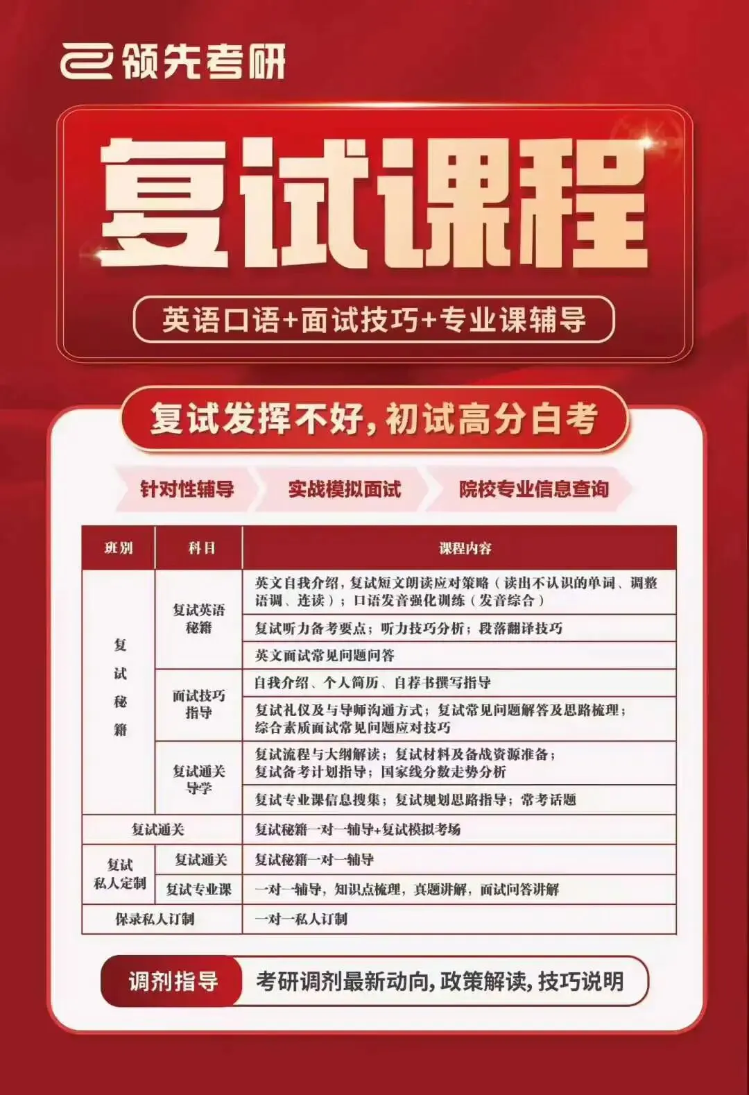 大家在休整之后务必要找回考前的状态,把最后一步的复试也尽心的做好准备。拿到录取通知书的那一刻才算是真正的胜利!如果感觉自己准备还是没底,领先复试课将全方位为你做好指导与辅助,用最丰富的经验为你铺平考研的最后一段道路!