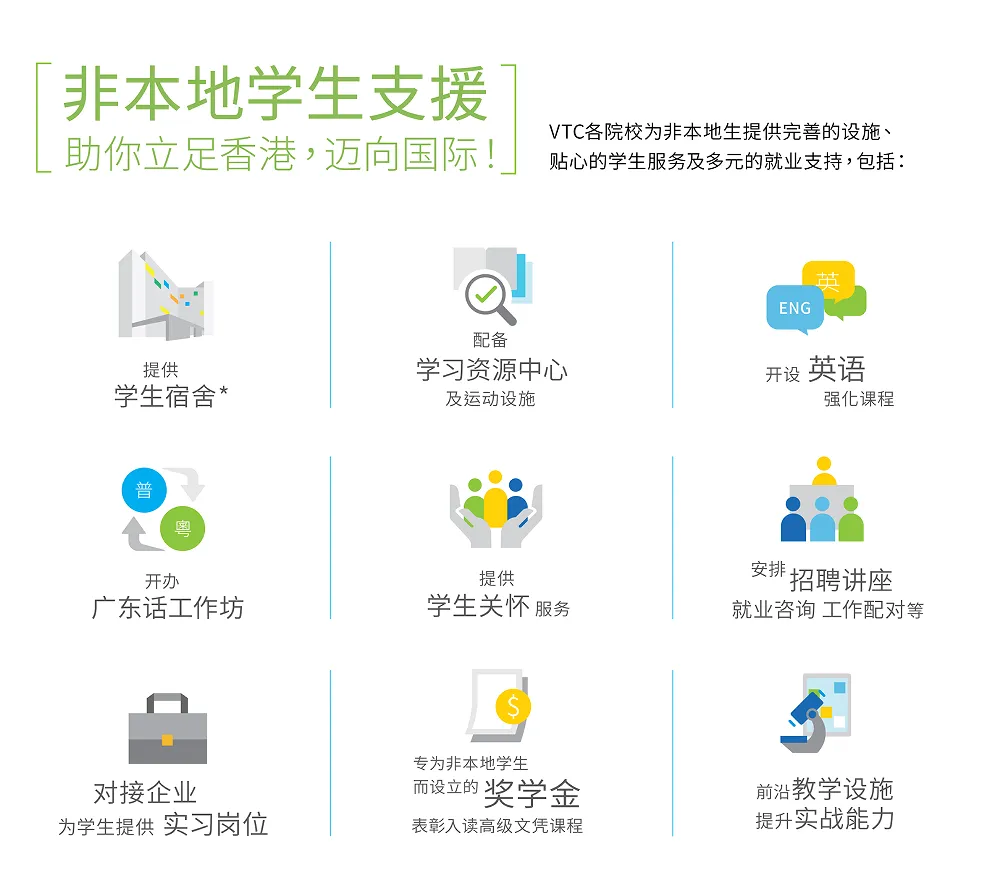 答:这也是家长们较为关心的问题之一。香港与内地文化相近、语言互通,极大降低了孩子的适应成本。VTC目前有34个VPAS合资格课程,其中18个支持普通话或粤语授课。入学后,学校有提供英语强化课程及粤语工作坊,协助学生适应香港的学习和日常生活,而且学校食堂、宿舍等配套设施完善,生活便捷舒适。