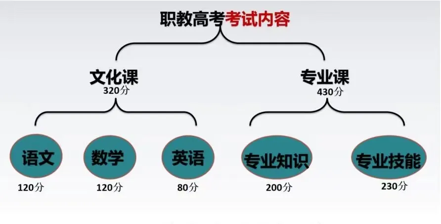 职教高考采取文化课+专业课的考试模式,其中语文120分,数学120分,英语80分,满分320分,只占最终成绩的43%;专业知识200分,专业技能230分,总分430分,占最终成绩的57%。与夏季高考相比难度更低,升学率更高。