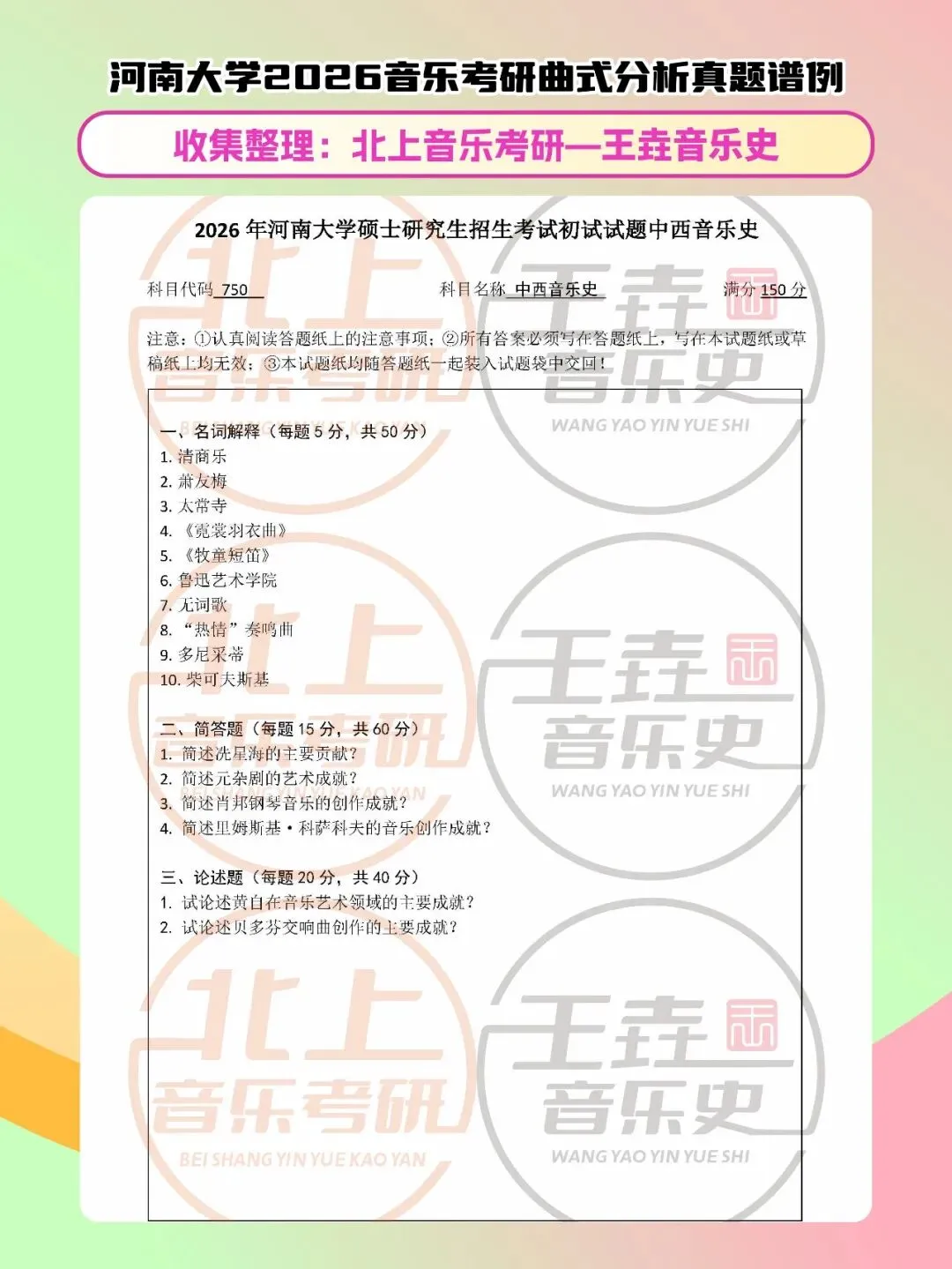 河南大学2026音乐考研音乐史真题|北上音乐考研-王垚音乐史工作室收集整理