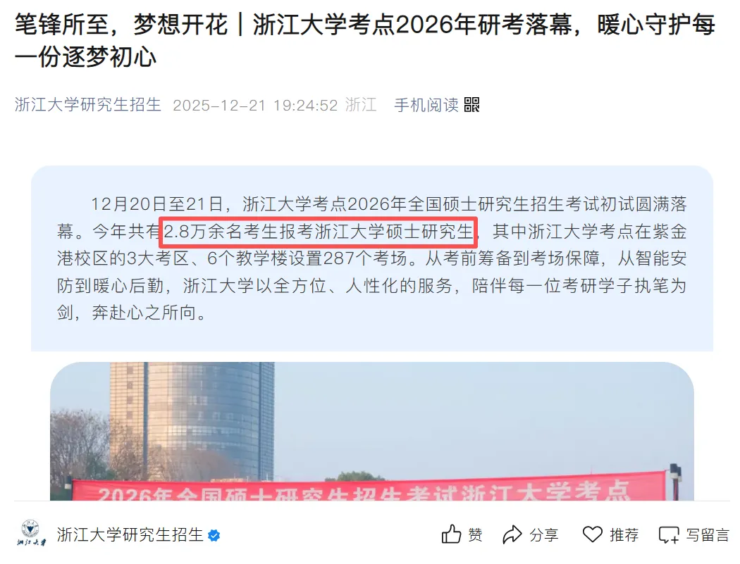 今年共有2.8万余名考生报考浙江大学。2024~2025浙江大学报考人数未知,2023年浙江大学报考人数达到3.1万余人。