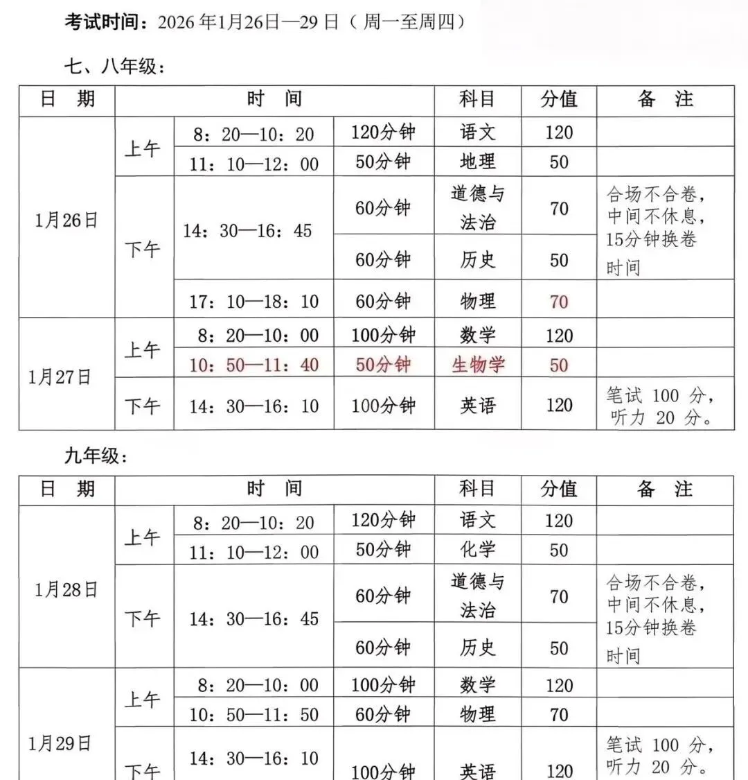 目前河南多地已公布期末考试安排