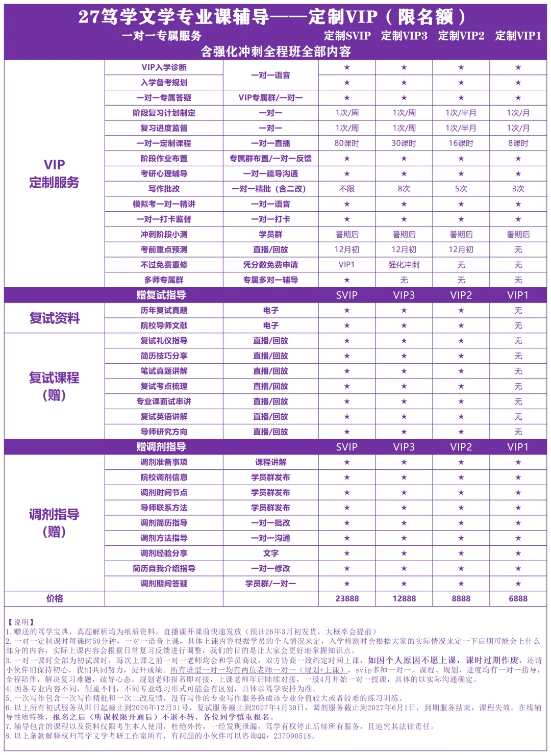 成为VIP学员,相当于多了一个专属的督导员+优秀讲师。你们是朋友,是师生,将来甚至可能是同门。一对一的辅导员清楚你的自身基础,清楚你的复习状态,清楚你的优点也清楚你的劣势。结合你的实际情况帮助你来制定专属的复习计划。除了一对一复习计划制定,答疑,一对一专属课时,作文精批,模考分析批改等等,从VIP对接开始,一直到考研结束,你拥有的是多方位,全面化的专属服务。而且VIP班型都是有两个一对一老师哦(SV则为多师),从生活到学习,全程陪伴,一起掌控复习!