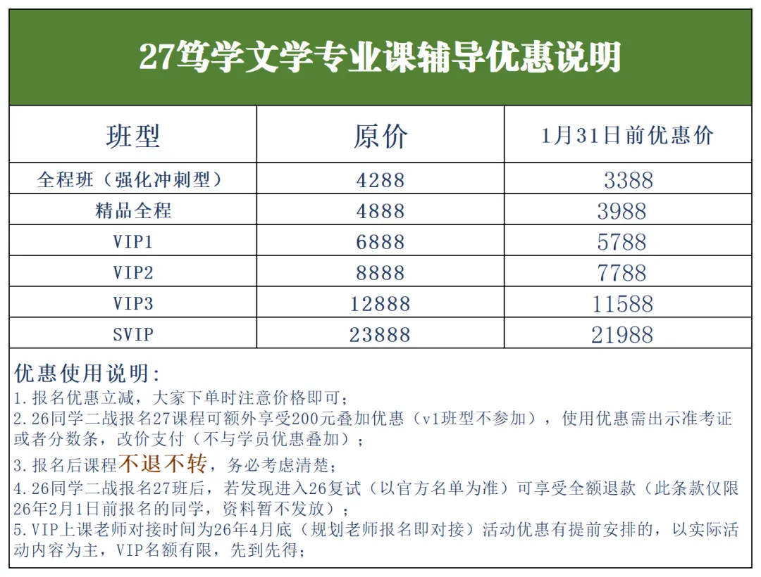 文学类各专业(古代,现当代,比文,文艺学)价格以及对应优惠均如上图所示,语言类专业(文字学,语言学,文献学)在上述价格的基础上额外优惠200元,学科语文以及文体学专业具体价格咨询学姐哦~