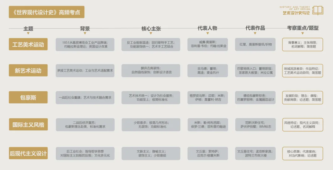 高频考点锚定需紧密结合考研真题,找到需要攻克的核心模块。设计考研中对《世界现代设计史》的考查具有高度聚焦性,高频考点主要集中在五大核心模块——即“工艺美术运动”“新艺术运动”“包豪斯”“国际主义风格”“后现代主义设计”。复习时需先梳理目标院校历年真题,统计各模块的考查频率与题型,再针对每个核心模块深挖细节。一般来说,我们需要明确其定义、产生背景、核心主张、代表人物及代表作,同时总结其历史意义与局限性。对于论述题高频考点,还需拓展其对当代设计的启示等。