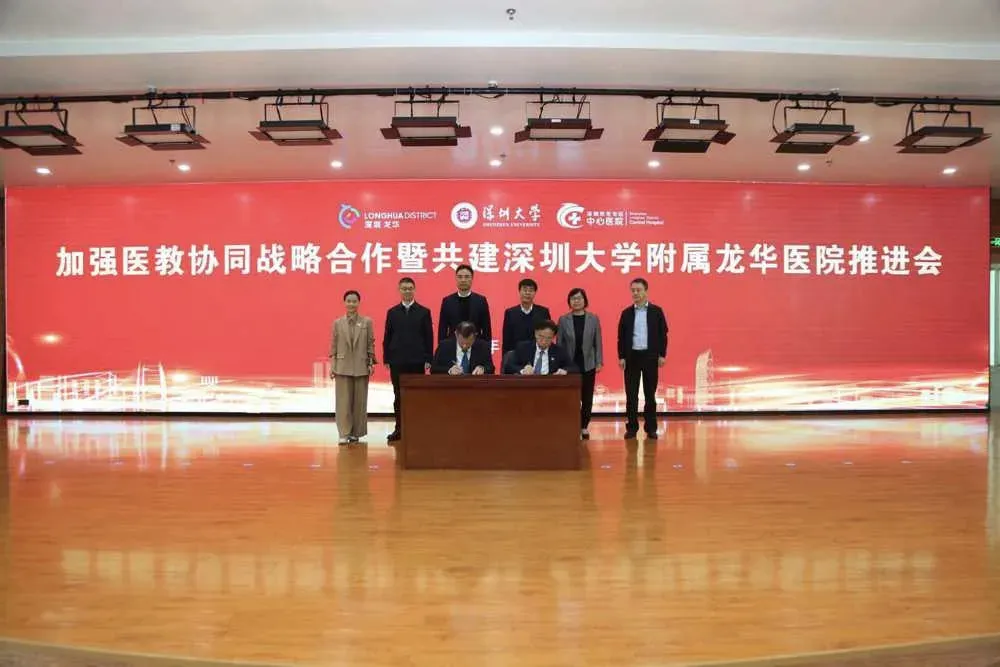 1月6日上午,深圳大学附属龙华医院合作共建推进会于龙华区中心医院举办。龙华区卫健局、龙华区中心医院分别与深圳大学签约,前者达成医教协同战略合作,后者敲定医院共建事宜,现场完成新院揭牌。