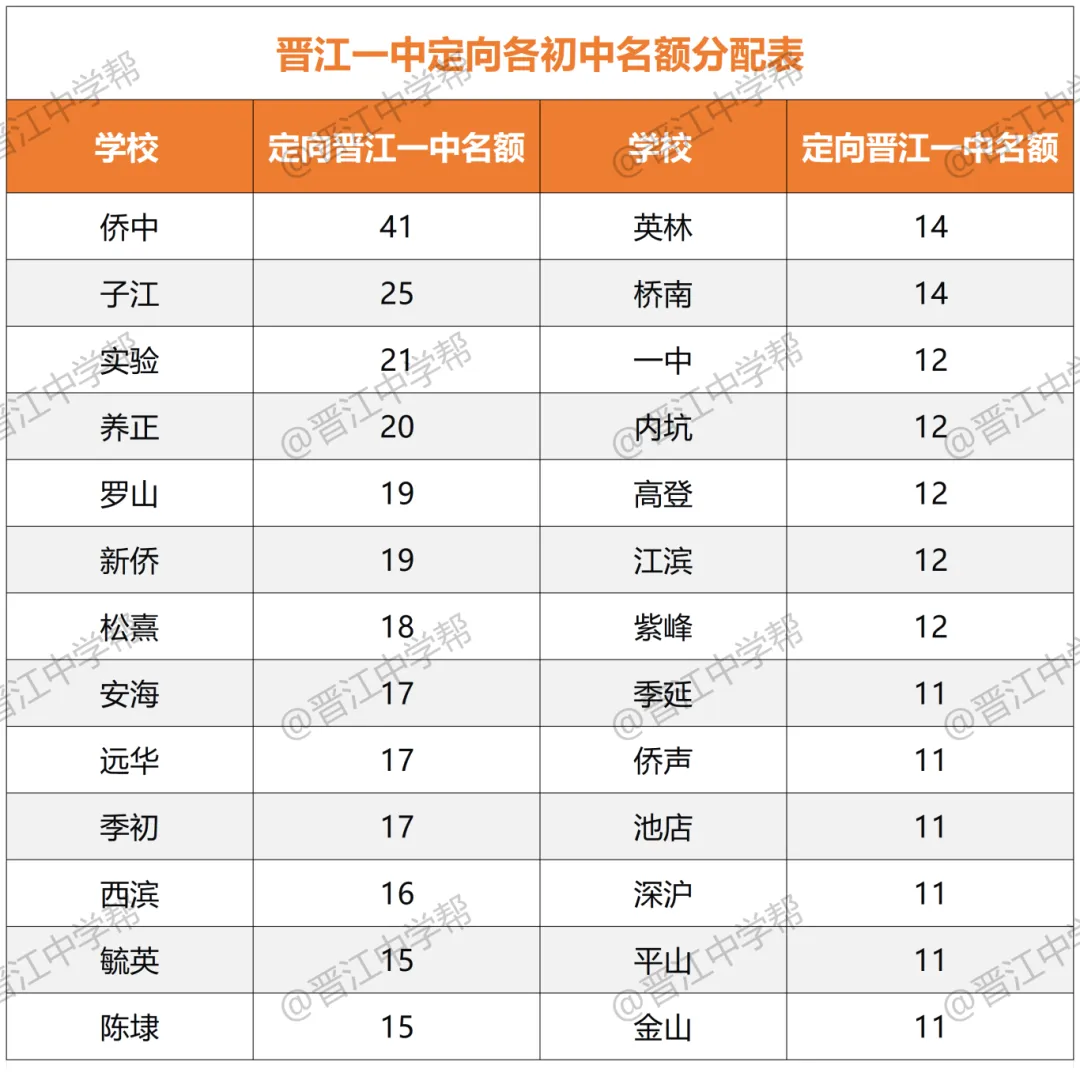 由于晋江一中大部分生源都是定向降分进来的,因此定向数据才是重中之重。我们来看一下25年晋江一中定向生名额分配情况: