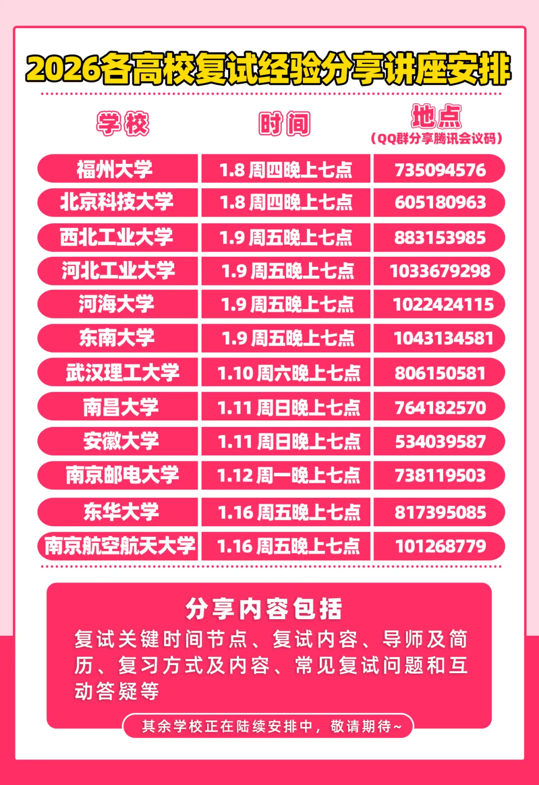 近期我们安排了部分院校的2026复试经验分享讲座,帮助大家更好的了解相关复试内容,做好复试规划!具体安排如下: