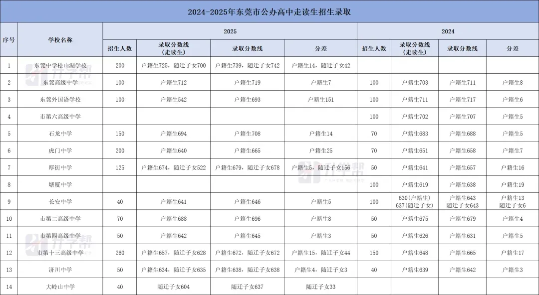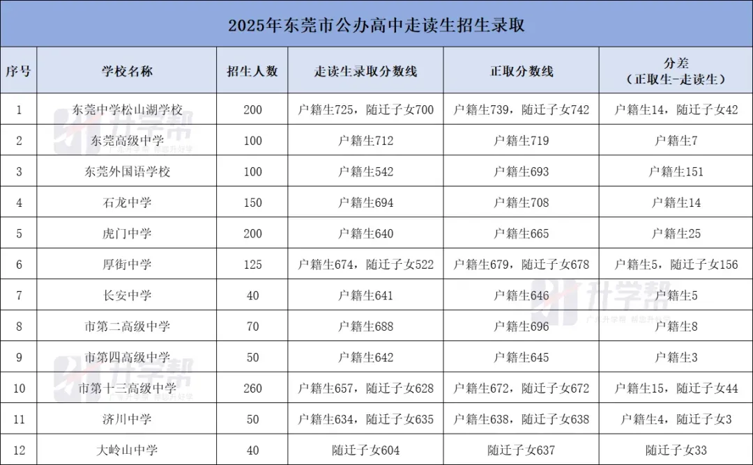 2025年,东莞有12所公办高中招生走读生1385人,其中公办十一大校有4所招生,分别是松莞招200人、高级招100人、莞外招100人、龙中招150人,另外十三中招260人、虎门中学招200人、厚街中学招125人。以下为2025年东莞公办高中走读生招生录取情况,和东莞升学小陈老师(138 2721 2929 微信同号)一起来看看吧~