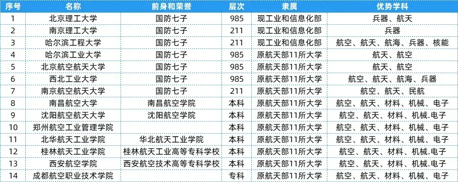 航天航空类特色院校共有14所,层次、隶属及优势学科等具体信息可以参考下表~