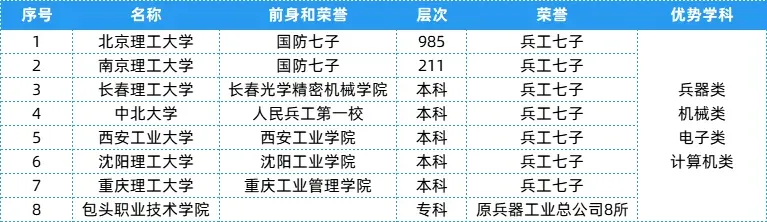 兵器工业总公司相关院校共有8所,层次、隶属及优势学科等具体信息可以参考下表~