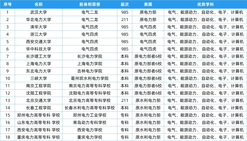 电力部相关院校共有18所,层次、隶属及优势学科等具体信息可以参考下表~