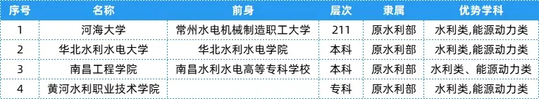水利部相关院校共有4所,层次、隶属及优势学科等具体信息可以参考下表~