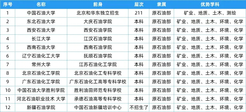 石油部相关院校共有12所,层次、隶属及优势学科等具体信息可以参考下表~