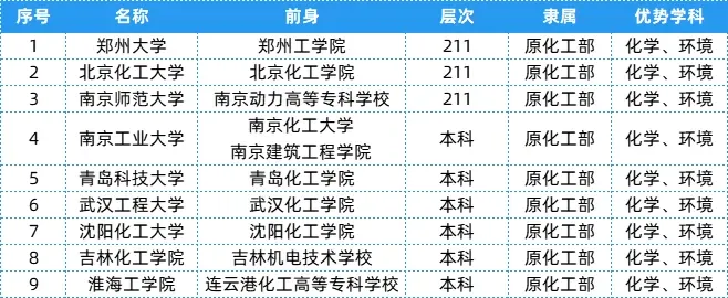 化工部相关院校共有9所,层次、隶属及优势学科等具体信息可以参考下表~