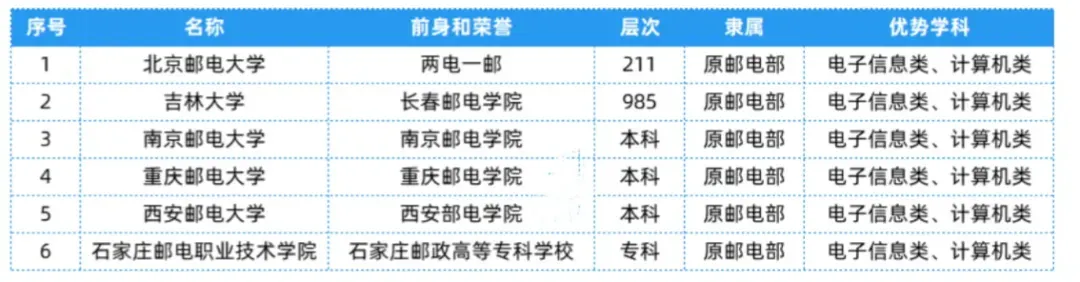 邮电部相关院校共有6所,层次、隶属及优势学科等具体信息可以参考下表~