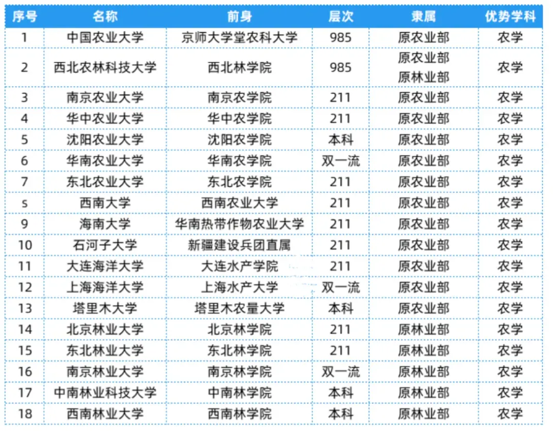 农业林业部相关院校共有18所,层次、隶属及优势学科等具体信息可以参考下表~