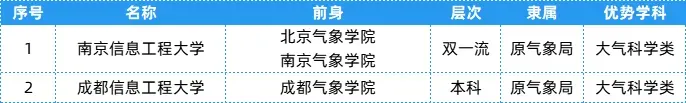 气象局相关院校共有2所,层次、隶属及优势学科等具体信息可以参考下表~