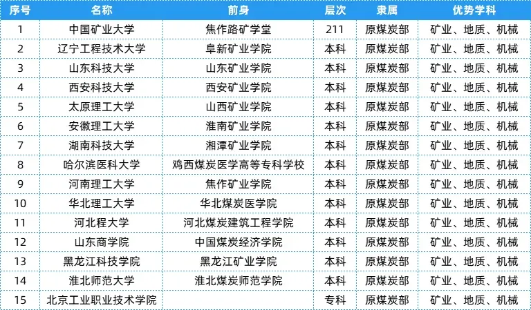 煤炭部相关院校共有15所,层次、隶属及优势学科等具体信息可以参考下表~
