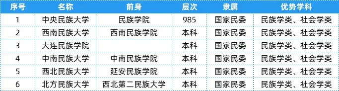 国家民委下属院校共有6所,层次、隶属及优势学科等具体信息可以参考下表~