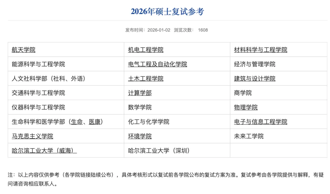 1月2日,哈尔滨工业大学航天学院、机电工程学院 、材料科学与工程学院、电气工程及自动化学院、土木工程学院、建筑与设计学院、建筑与设计学院等公布了核心复试信息。官网可以查到,复试指导文件、复试加试科目、部分专业复试内容。
