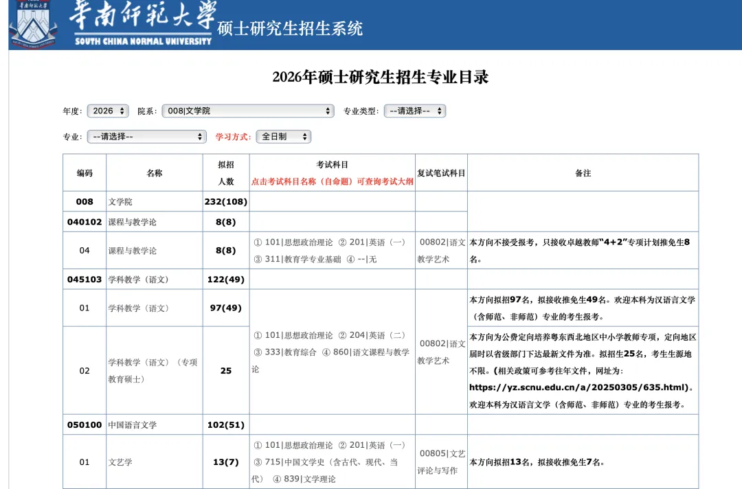 华南师范大学硕士研究生招生系统公布的招生专业目录内含有文学院等各个院系的复试笔试科目及考试大纲。