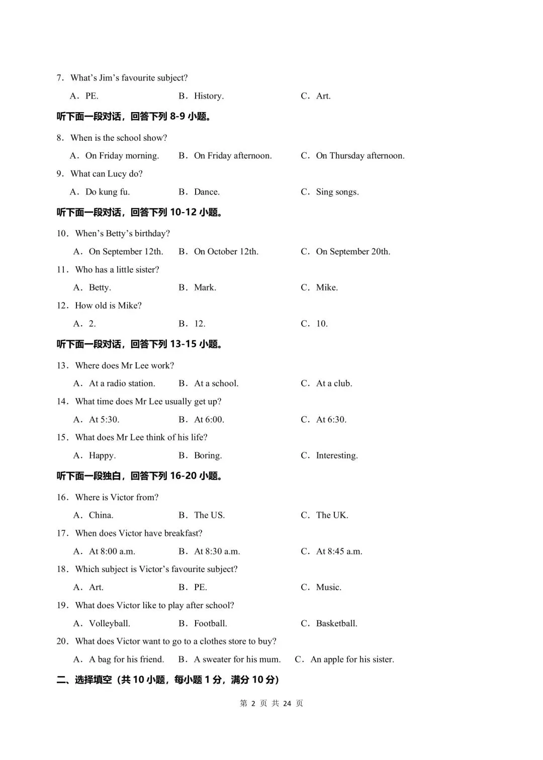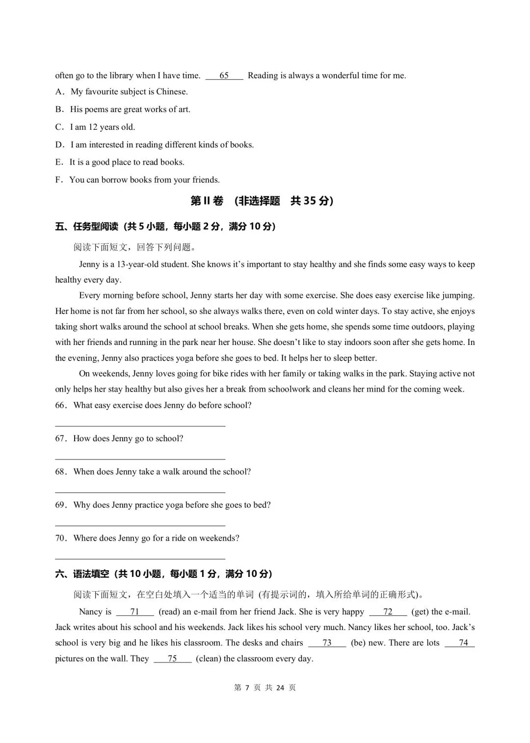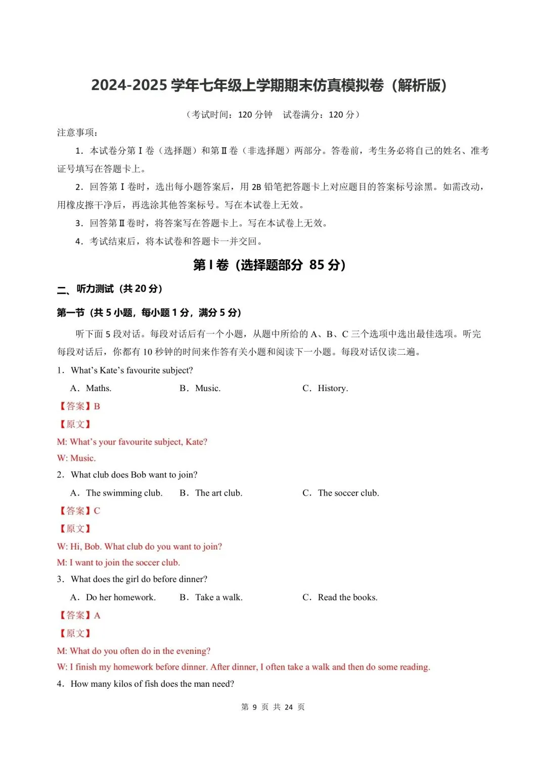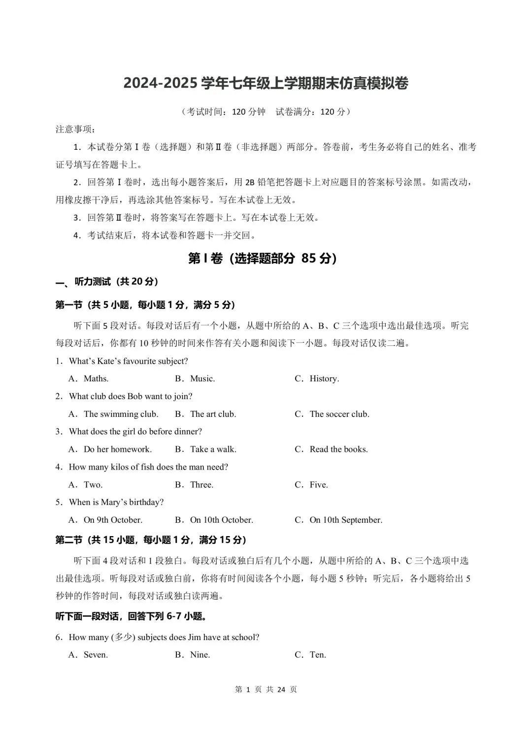 今日分享:新版初一七年级上册人教版英语期末考试真题卷含答案可打印