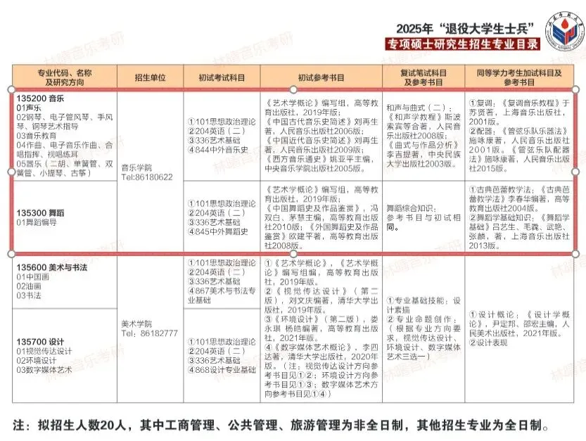 我校“退役大学生士兵”专项硕士研究生招生专业仅限(全日制)体育硕士、(非全日制)工商管理硕士、(非全日制)公共管理硕士、(全日制)会计硕士、(非全日制)旅游管理硕士、(全日制)戏剧与影视硕士、(全日制)美术与书法硕士、(全日制)设计硕士、(全日制)音乐硕士、(全日制)舞蹈硕士、(全日制)图书情报硕士等11个专业学位领域。考生报名时应选择填报退役大学生士兵专项计划,并按要求填报本人入伍前的入学信息以及入伍、退役等相关信息,复试前须向我校提供《入伍批准书》、《退出现役证》(限士兵)和学历信息进行复核。