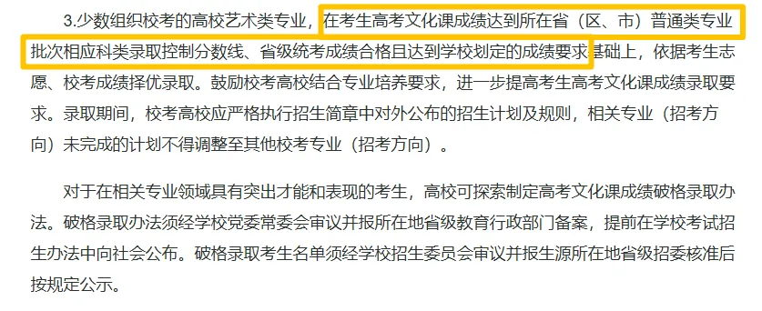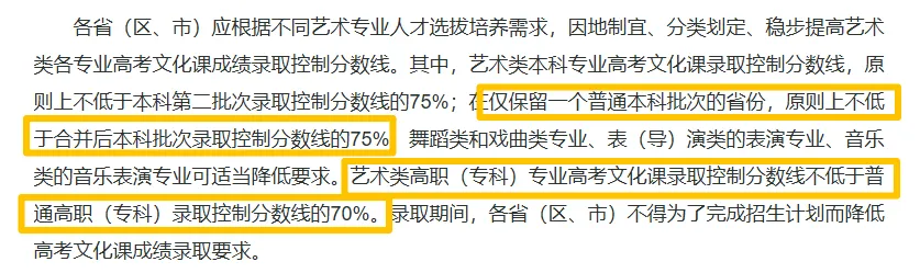 文化课成绩,近几年要求不断提高,以2026年最新政策为例,原则上本科不低于批次录取控制分数线的75%,专科不低于批次控制线的70%;舞蹈类和戏曲类专业、表(导)演类的表演专业、音乐类的音乐表演专业可适当降低要求。这大大提高了文化课的门槛,部分省份的文化课本科批次线超过400分。