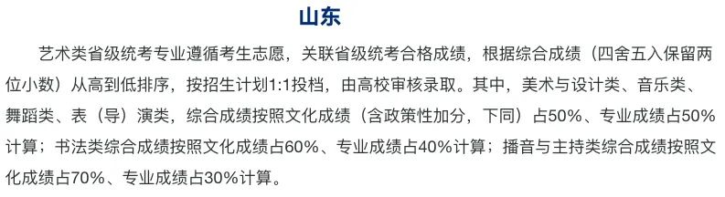 以山东省为例,美术设计类、音乐类、舞蹈类、表(导)演类、播音与主持类,文化成绩和专业成绩分别占比50%;书法类,文化成绩占60%、专业成绩40%;播音与主持类,文化成绩占比70%、专业成绩占比30%。