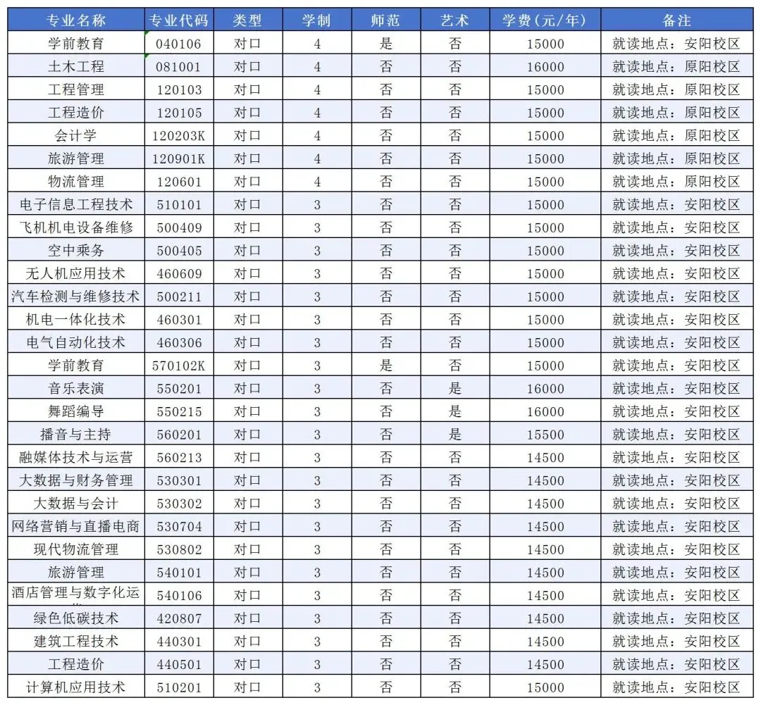 第十一条 就读安阳校区的对口本科专业有学前教育;就读安阳校区的对口专科专业有电子信息工程技术、飞机机电设备维修、空中乘务、无人机应用技术、汽车检测与维修技术、机电一体化技术、电气自动化技术、学前教育、音乐表演、舞蹈编导、播音与主持、融媒体技术与运营、大数据与财务管理、大数据与会计、网络营销与直播电商、现代物流管理、旅游管理、酒店管理与数字化运营、绿色低碳技术、建筑工程技术、工程造价、计算机应用技术。