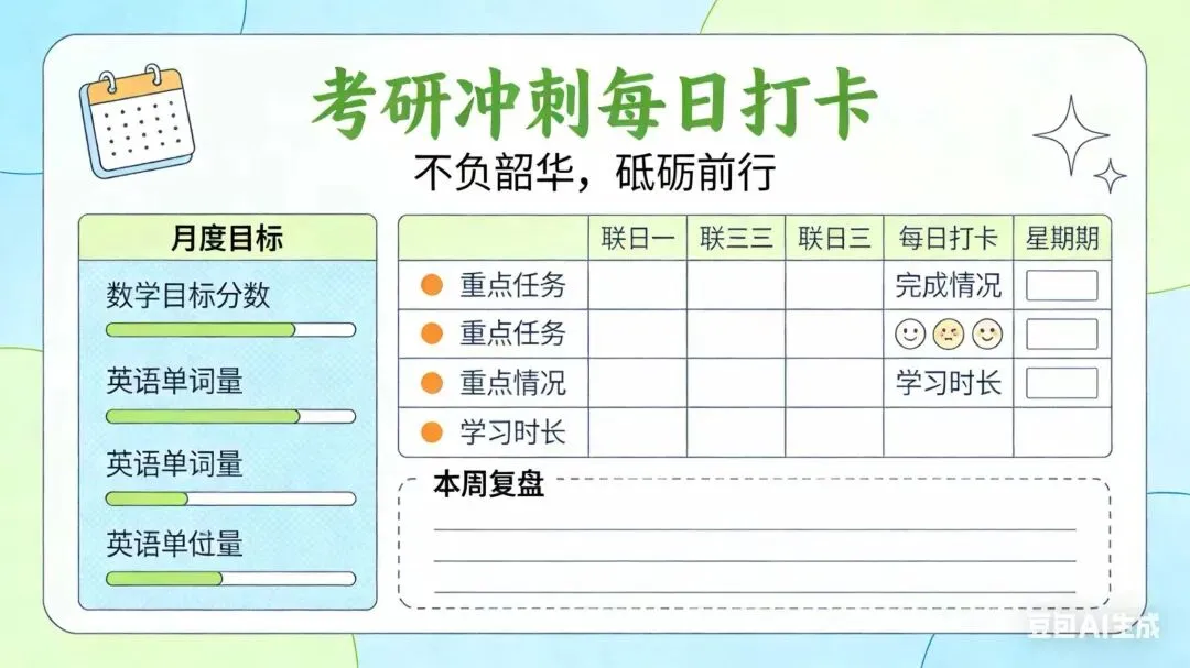 寒假结束后(3-6月),备考进入系统推进阶段,核心是夯实各科基础、确定最终院校,为暑假强化做好充分准备。每天有效学习时长建议保持6—8小时,循序渐进提升强度。确定最终院校及专业:3月关注26考研国家线、院校线及复试动态,结合自身基础和学习效果,敲定最终报考院校和专业;确认最新考试科目、参考书目,若院校有调整及时适配,避免复习偏离方向。深化公共课基础:英语持续背诵词汇(累计攻克5500核心词),精研语法长难句,开始精读早年真题阅读(2005年后),不用做题,重点是翻译、积累高频词和固定搭配;数学过完教材(高数、线代、概率),做完课后习题和基础辅导书习题,标记易错点,搭建完整知识框架,强化知识点理解。推进专业课基础学习:通读1-2遍指定教材,用思维导图完善知识框架,标记重点章节和核心概念;结合学长学姐笔记梳理考点,开始初步记忆简单知识点,为暑假强化背诵和刷题筑牢基础。关键提醒:4-5月关注目标院校复试及调剂情况,了解院校录取偏好;6月底前务必完成全学科基础阶段学习,避免拖延影响暑期强化进度。大三暑假至大四上初试,备考分为强化、冲刺两大阶段,每个阶段任务明确,抓准重点才能高效提分,以下是详细规划。核心目标:突破薄弱点,聚焦真题训练,搭建各科解题体系,实现从基础到强化的跨越。每天有效学习时长建议保持8—10小时,合理分配各科时间。英语:每天3小时,重点攻克阅读理解,精刷近10—15年真题阅读部分,逐篇分析错题原因(词汇、语法、解题思路),总结高频词、固定搭配及阅读技巧;同步积累生词短语,坚持每日背诵,避免词汇遗忘。数学:每天3小时以上,大量刷真题和基础强化类辅导书,按题型分类训练解题方法,强化计算能力,总结常见题型的解题规律和易错点;每周复盘一次错题,针对性补全知识漏洞,不追求速度,确保每道题都吃透。专业课:每天2—3小时,进入强化学习阶段,结合真题梳理高频考点和重难点,开始系统背诵核心知识点;刷历年真题,熟悉院校出题风格和题型,标记高频考点和冷门知识点,针对性强化;同时补充专业相关拓展内容,提升答题深度。政治:每天1—1.5小时,启动基础复习,学习核心理论知识点,搭配习题册刷选择题,不用背诵主观题,重点是理解知识点、培养题感,同步积累时政热点初步内容。(二)大四上学期(9-10月):强化冲刺期,适配考纲稳提升核心目标:适配最新考纲变化,深化专项复习,完成考研报名,提升解题速度和准确率。每天有效学习时长保持8—10小时,针对性突破薄弱环节。关注考纲与报名:9月密切关注27考研招生简章和考试大纲,确认科目、参考书目是否有变动,及时调整复习计划;9月下旬参与预报名,10月完成正式报名及缴费,仔细核对报名信息,避免失误。公共课强化:英语突破新题型、翻译、写作,背诵作文模板并灵活改写,每周练1—2篇作文;数学刷真题套卷,强化解题节奏,针对性攻克薄弱题型。政治二刷习题册,聚焦选择题正确率,深入学习时政热点,开始梳理主观题答题思路。专业课强化:进行二轮复习,深化知识点记忆,重点背诵高频考点和核心概念;二刷真题,总结答题技巧和得分点,模拟答题过程,提升答题规范性和速度。(三)大四上学期(11-12月):终极冲刺期,决胜初试核心目标:全真模拟考试,查漏补缺,调整心态,全力备战初试。每天有效学习时长保持8—10小时,注重效率和应试状态。完成现场确认与考前准备:11月按要求完成报名现场确认,核对个人信息;12月打印准考证,熟悉考场规则和路线,准备好考试用品。全学科全真模拟:按考研初试时间进行整套试卷模拟,适配答题节奏,优化时间分配;整理错题本,查漏补缺,针对性巩固薄弱知识点。重点突破核心内容:英语打磨作文模板,每天背诵并仿写;政治集中背诵主观题素材和模板,结合时政热点优化答题思路;专业课回归核心考点,反复背诵记忆,确保知识点无遗漏。调整心态与作息:避免过度焦虑,保持规律作息,适配考试时间,以最佳状态迎接初试。来源:ZKY食科学院