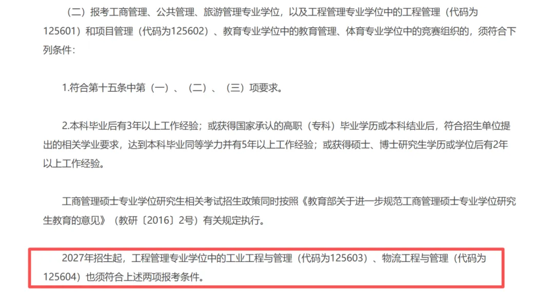 备战2027年研考的同学们注意啦!小编从研招网1月7日发布的资讯中了解到一项重要调整,关乎部分工程管理类专业的报考要求,大家一定要仔细关注!具体调整内容如下:研招网资讯1月7日发文,提醒备战2027年研考的同学注意一项调整:教育部此前发布的《2026年全国硕士研究生招生工作管理规定》提到,自2027年招生起,报考工程管理专业学位中的工业工程与管理(代码:125603)、物流工程与管理(代码:125604),须符合文件中规定的相关报考条件。
