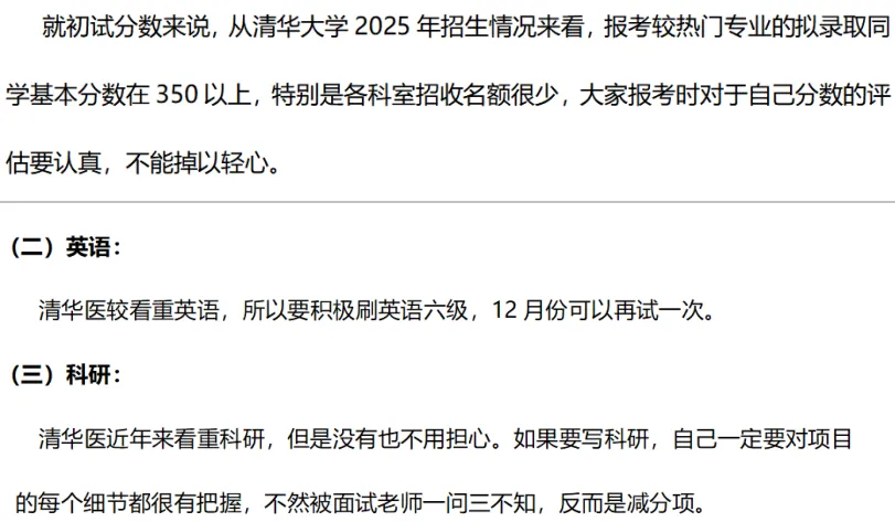 就初试分数来说,从清华大学2025年招生情况来看,报考较热门专业的拟录取同学基本分数在350以上,特别是各科室招收名额很少,大家报考时对于自己分数的评估要认真,不能掉以轻心。