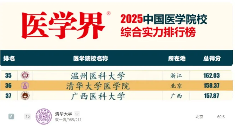 1.学院实力:2025医学界中国医学院校综合实力排行榜-清华大学第36名;2025软科中国大学临床医学排名第15名,学科层次A。
