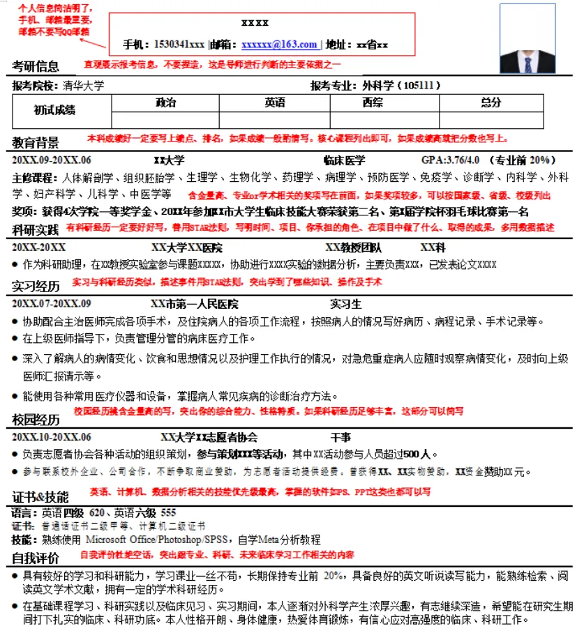 最有亮点、相关性最高的信息要放在简历最显眼的地方,建议重点突出英语、科研相关内容,科研实在没有的可以写毕设,写本科做过的实验以及掌握的实验技能、数据处理技能,专硕可以写实习轮转过的科室和学到的临床技能。