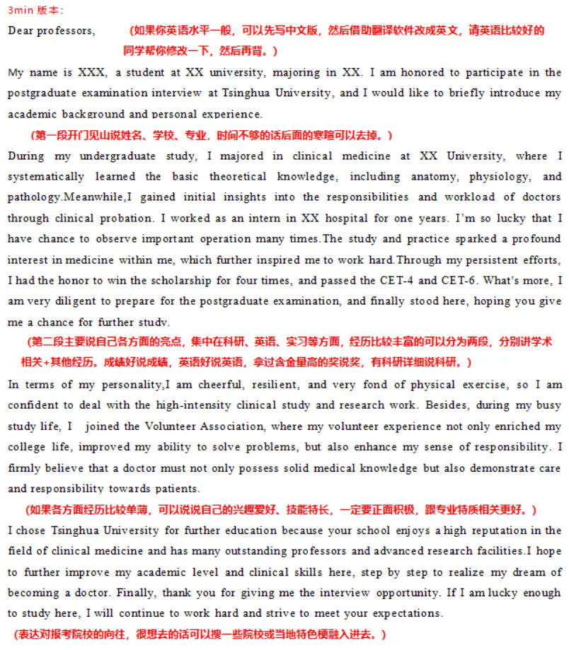 中英文版本都要准备,就算科室只要求中文/英文也准备双份,自我介绍重点准备英文版本,大概3min左右,要非常熟练。中文版本要更加注重信息准确性,注意不要跟简历内容自相矛盾。大家平时练习自我介绍时,可以对着镜子,注意调整自己的表情,不要像背书机器一样,尽量自然大方。