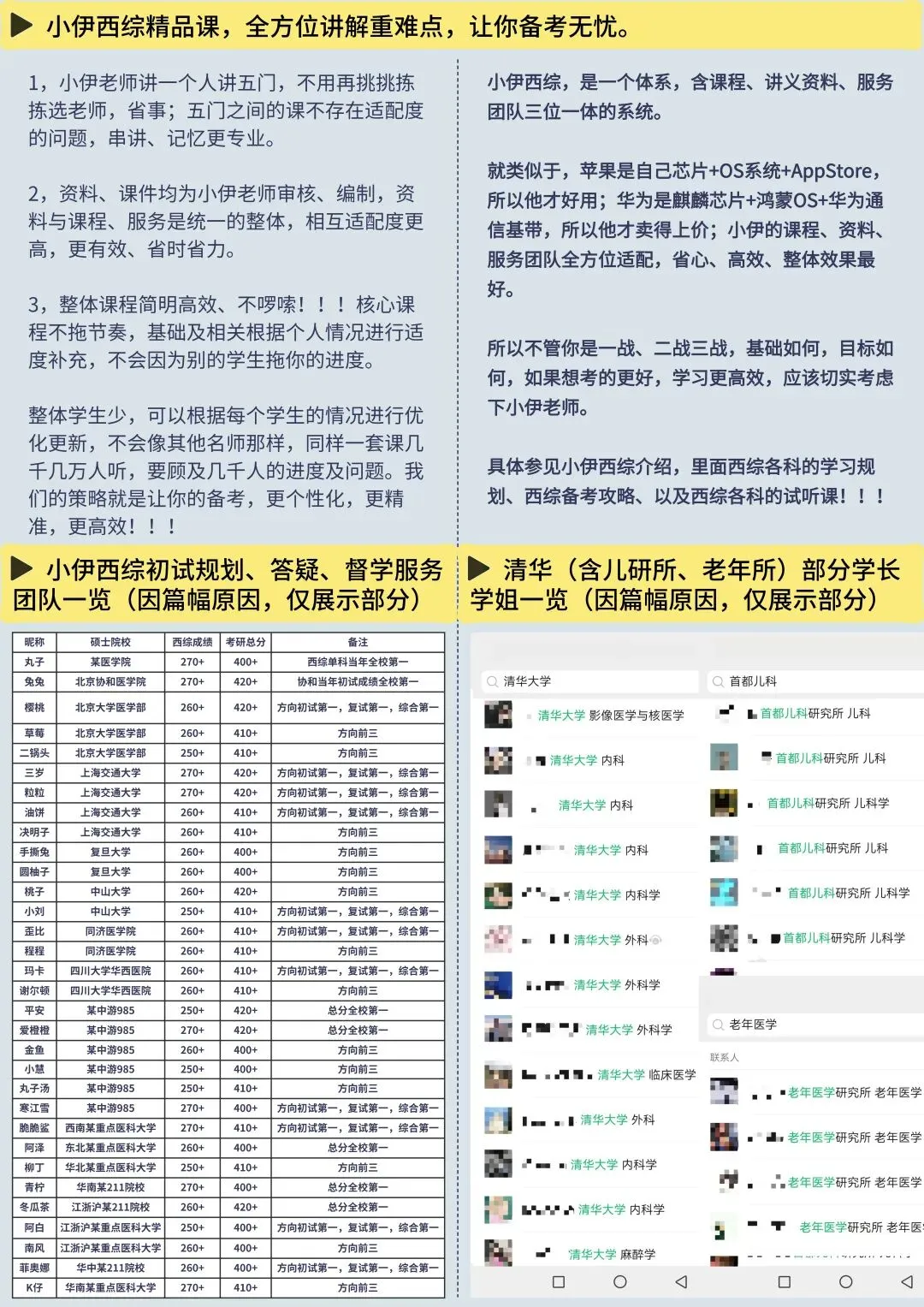 你买的不仅仅是一堆“名师课件”,而是名师、资料、课程浑然一体的一个体系,我们提供的是临床、西综全套解决方案,是有人带、有人盯,有个性化辅导的超高端西综考研班。带你的还是西综270+,总分420+的大佬!!!(根据考生情况适配,带教团队最低分不低于380)