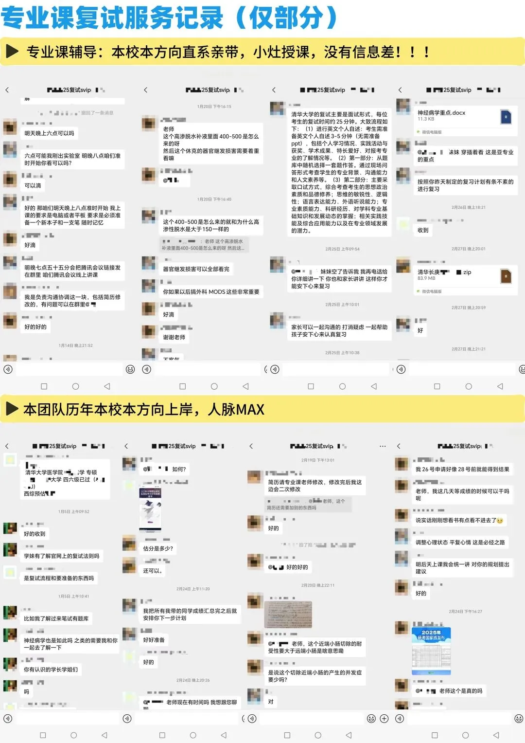 本校各个科室、各个医院,几乎都有我们各个团队的初试、复试录取学员、团队服务成员,没有什么打听不到的,所有关于本校初试、复试的相关问题,通通解决。你们可以看一下我们的通讯录截图,看一下我们资料页截图,然后看一下我们关于复试的,各项带学生的服务记录,你会发现,做本校考研初复试的团队,比我们专业的,几乎没有!!!