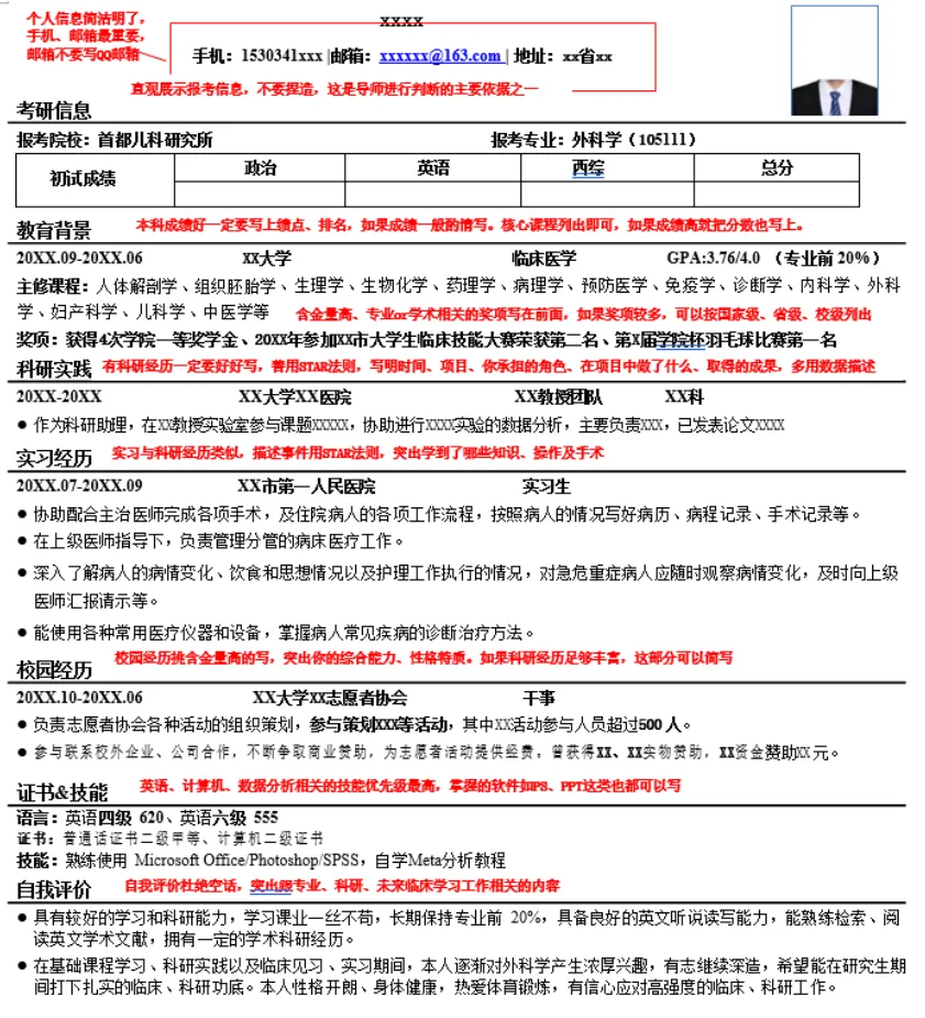 最有亮点、相关性最高的信息要放在简历最显眼的地方,建议重点突出英语、科研相关内容,科研实在没有的可以写毕设,写本科做过的实验以及掌握的实验技能、数据处理技能,专硕可以写实习轮转过的科室和学到的临床技能。