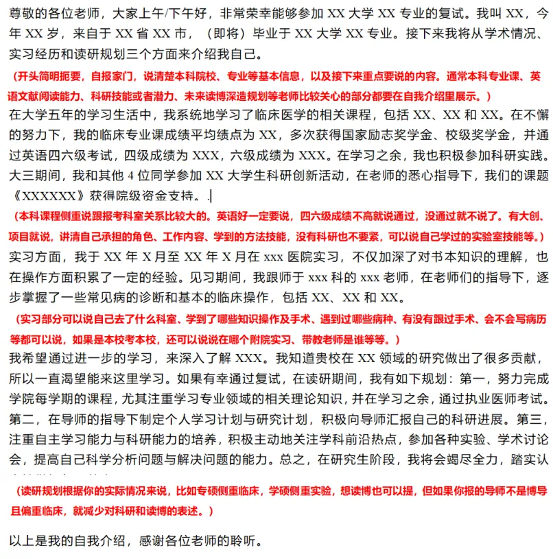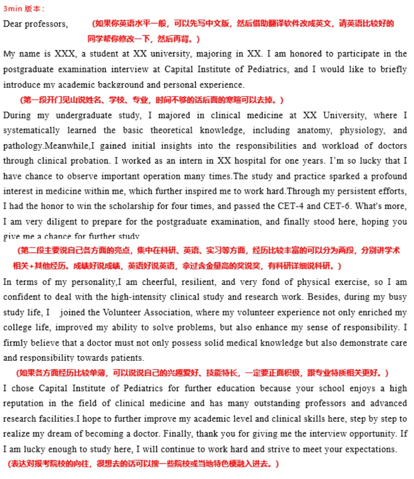 中英文版本都要准备,就算科室只要求中文/英文也准备双份,自我介绍重点准备英文版本,大概3min左右,要非常熟练。中文版本要更加注重信息准确性,注意不要跟简历内容自相矛盾。大家平时练习自我介绍时,可以对着镜子,注意调整自己的表情,不要像背书机器一样,尽量自然大方。