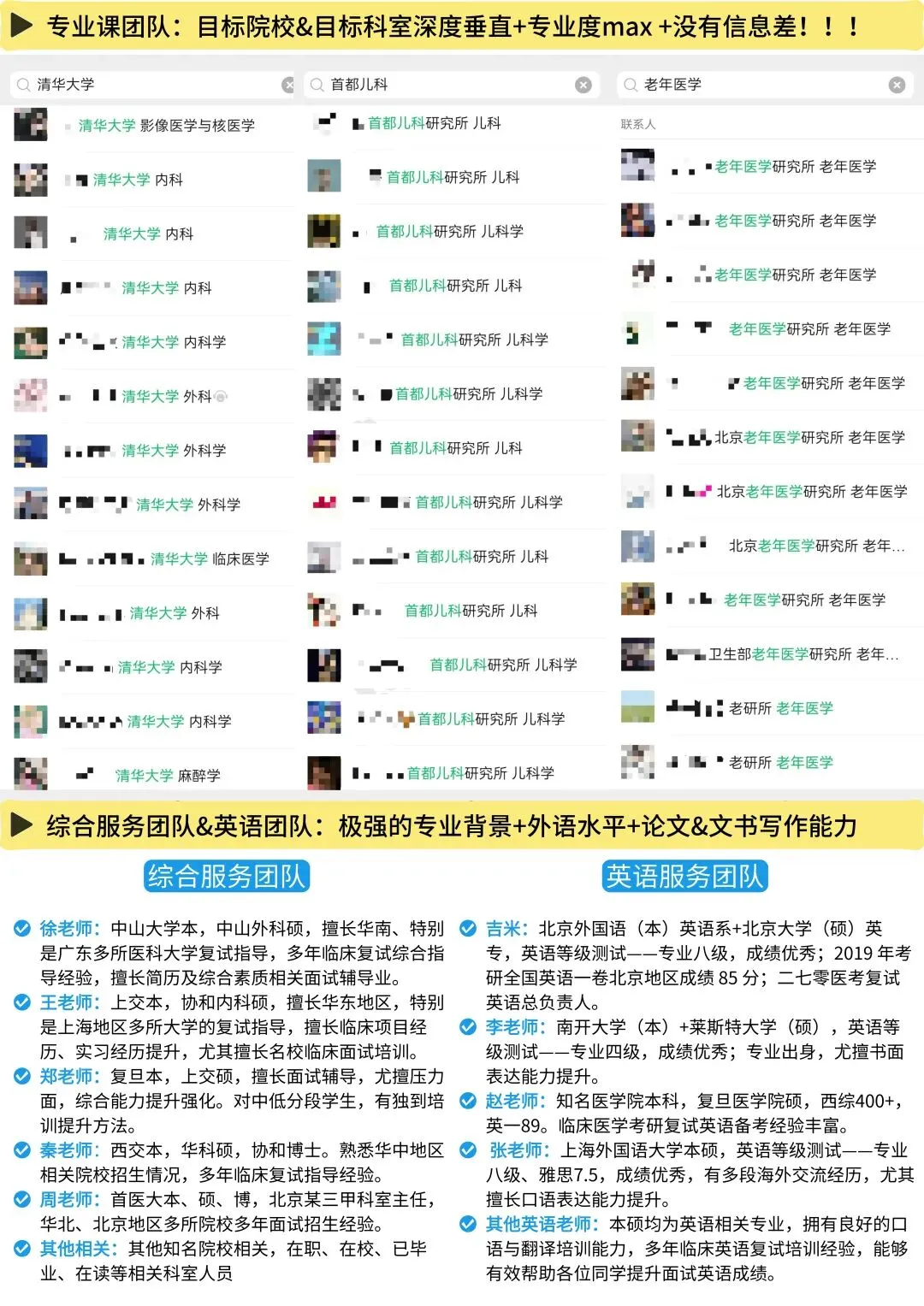 本校各个科室、各个医院,几乎都有我们各个团队的初试、复试录取学员、团队服务成员,没有什么打听不到的,所有关于本校初试、复试的相关问题,通通解决。你们可以看一下我们的通讯录截图,看一下我们资料页截图,然后看一下我们关于复试的,各项带学生的服务记录,你会发现,做本校考研初复试的团队,比我们专业的,几乎没有!!!